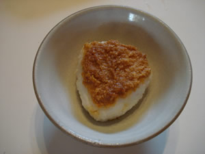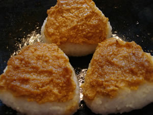 1.まず初めに、みそおにぎりですが、おにぎりの表面に仙台みそを塗るだけです。そのまま焼く場合もあります。