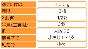 ④赤貝は切り込みを入れて2つに切り、ヒモは2~3つに切る。平貝は1cm角大に切る。この2つをあわせて、塩と酢各少々(分量外)をふりかけ、水気を切る。