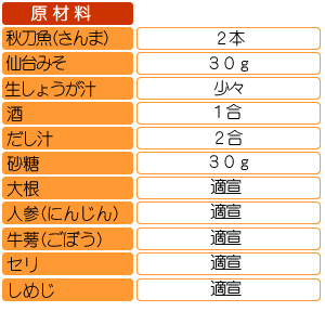 - ①秋刀魚を筒切りにし腹を水洗いし 鍋に味噌以外の調味料を合わせ秋刀魚をいれ煮る。