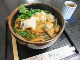 にんじん・ごぼう・山菜等をごま油で炒め、焼いたお餅とたっぷり薬味がのった、仙台みそ仕立ての温麺。