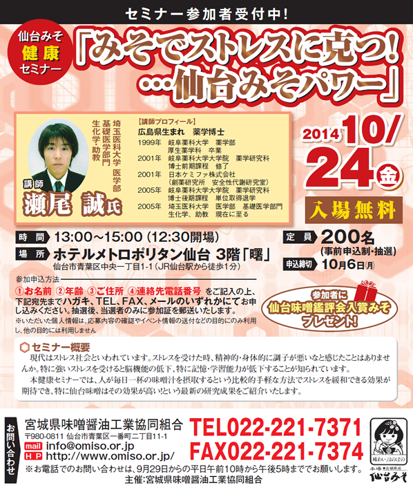 内 容:講演会「みそでストレスに克つ!…仙台みそパワー」