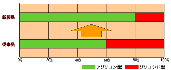 これまで仙台味噌中のイソフラボンはアグリコン化率が平均60%前後でした。しかし、製造工程を最適化することにより、新しい仙台味噌ではアグリコン化率を約20%以上アップさせることに成功しました。