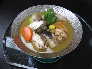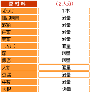 - ①ボッケは活を求め、表面の汚れを包丁又はたわしで取り除き食べやすい大きさに切ります。白菜・菊菜・しめじ・葱・銀杏・豆腐・牛蒡を鍋用にカットして置きます。