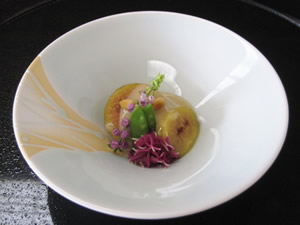 - ①無花果は皮を剥き八方出汁にて煮含めます。