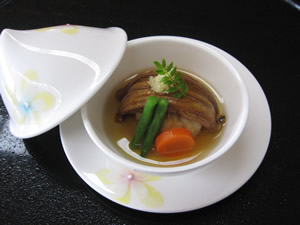 - ③器に180度の油で揚げた里芋饅頭を盛り煮穴子を饅頭の天に被せあしらいを付け完成です。