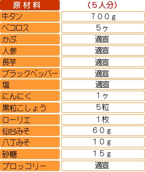 - ⑥牛タンを適当な大きさに切り、⑤を入れてとろみが出るまで弱火で野菜も一緒に煮込む。