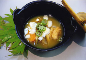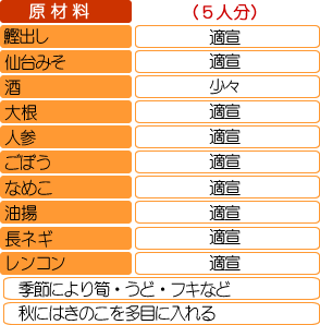 - ①大根・なめこ・レンコン・にんじん・ゴボウを下湯でして置く。油揚は油抜きする。