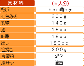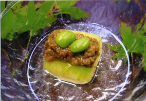 - ④肉味噌に片栗粉でとろみをつけて、冬瓜に掛ける。絹サヤで彩りする。