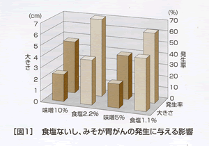 発がん物質とともに食塩を与えるとやはり胃がんが多く発生しますが、同量の塩分を含むみそを食べさせると発生率が低く、発生した場合でもガンが小さく抑えられたことがわかりました。